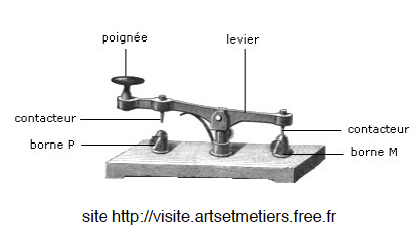Objet : le manipulateur est un système très simple pour émettre le signal. L’opérateur ferme et ouvre un circuit électrique. Il appuie sur la pioche pendant des temps courts ou longs pour coder sous formes d’impulsions électriques le message.
